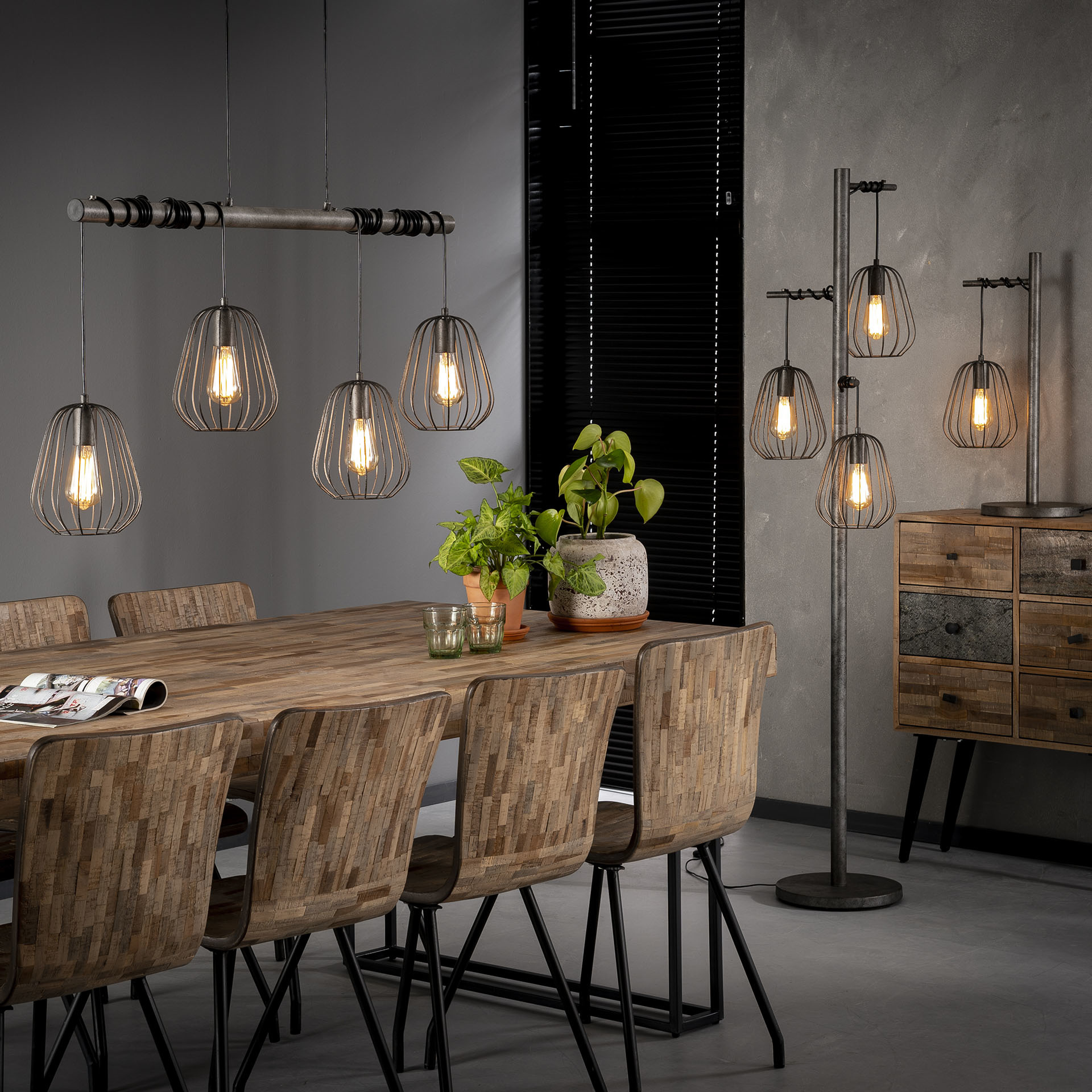 De kabels van de lamp kunnen om de buis worden gewikkeld, waardoor de draadstalen lampenkappen in verschillende hoogtes zijn op te hangen.