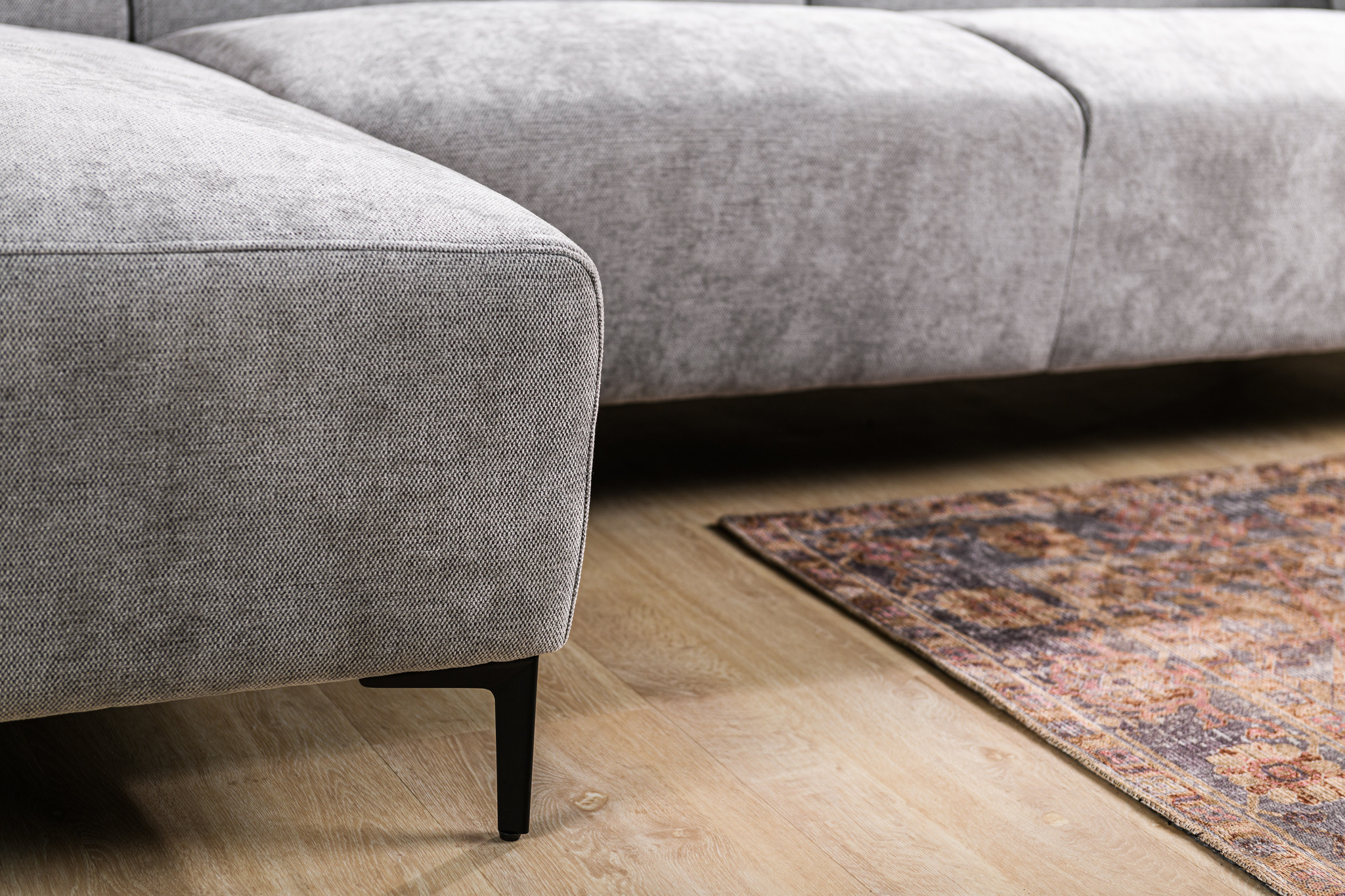 Chiné – Sofa – 3-zit bank – chaise longue links – grijs gespikkeld – zacht zittende polyester stof – stalen pootjes – zwart