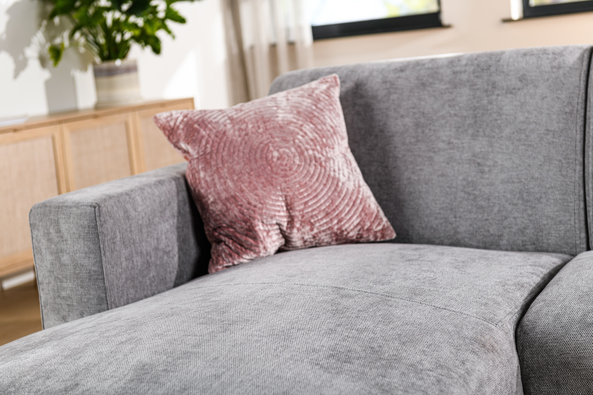Chiné sofa met 3 zitplaatsen waarvan 1 chaise longue links in zacht zittende polyester gespikkelde stof, ademend, hoge kleurvastheid, slijtvast en brand vertragend, met een trendy modieuze strakke look