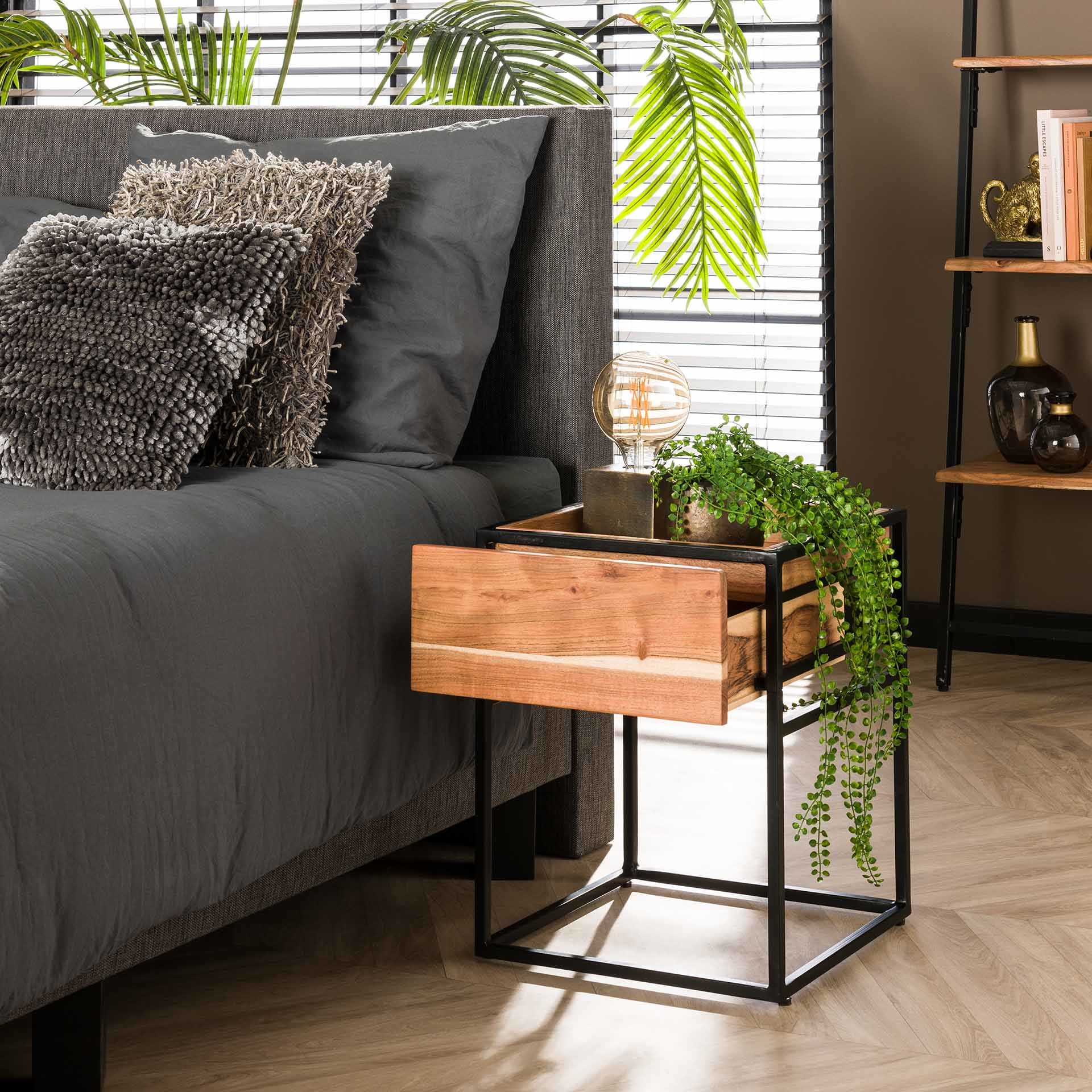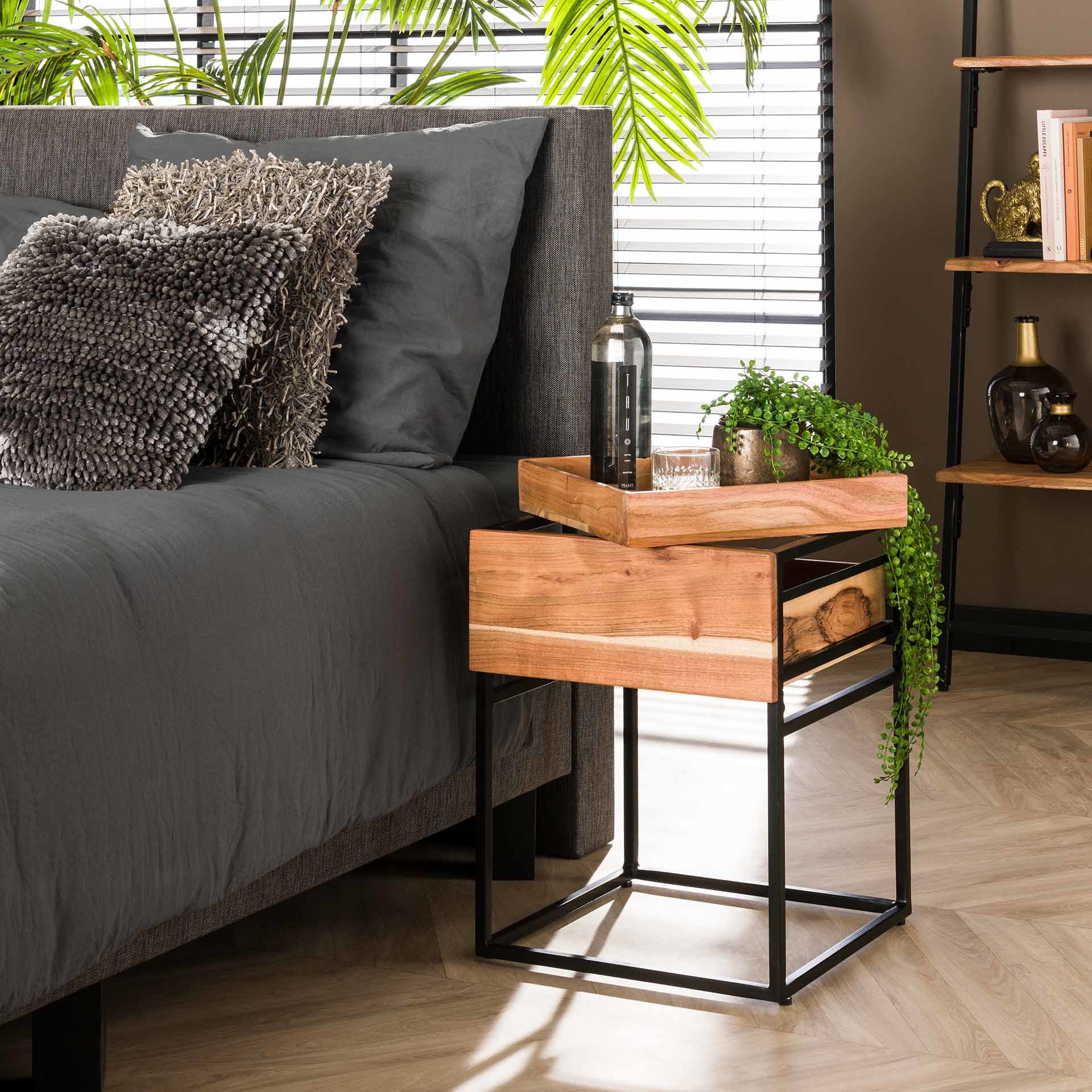 Dit originele nachtkastje met 1 lade is vervaardigd uit massief acaciahout en ondersteund door een stalen frame. De bovenkant van het nachtkastje bestaat uit een blad met een opstaande rand dat bovendien verwijderd kan worden en gebruikt te worden als dienblad.