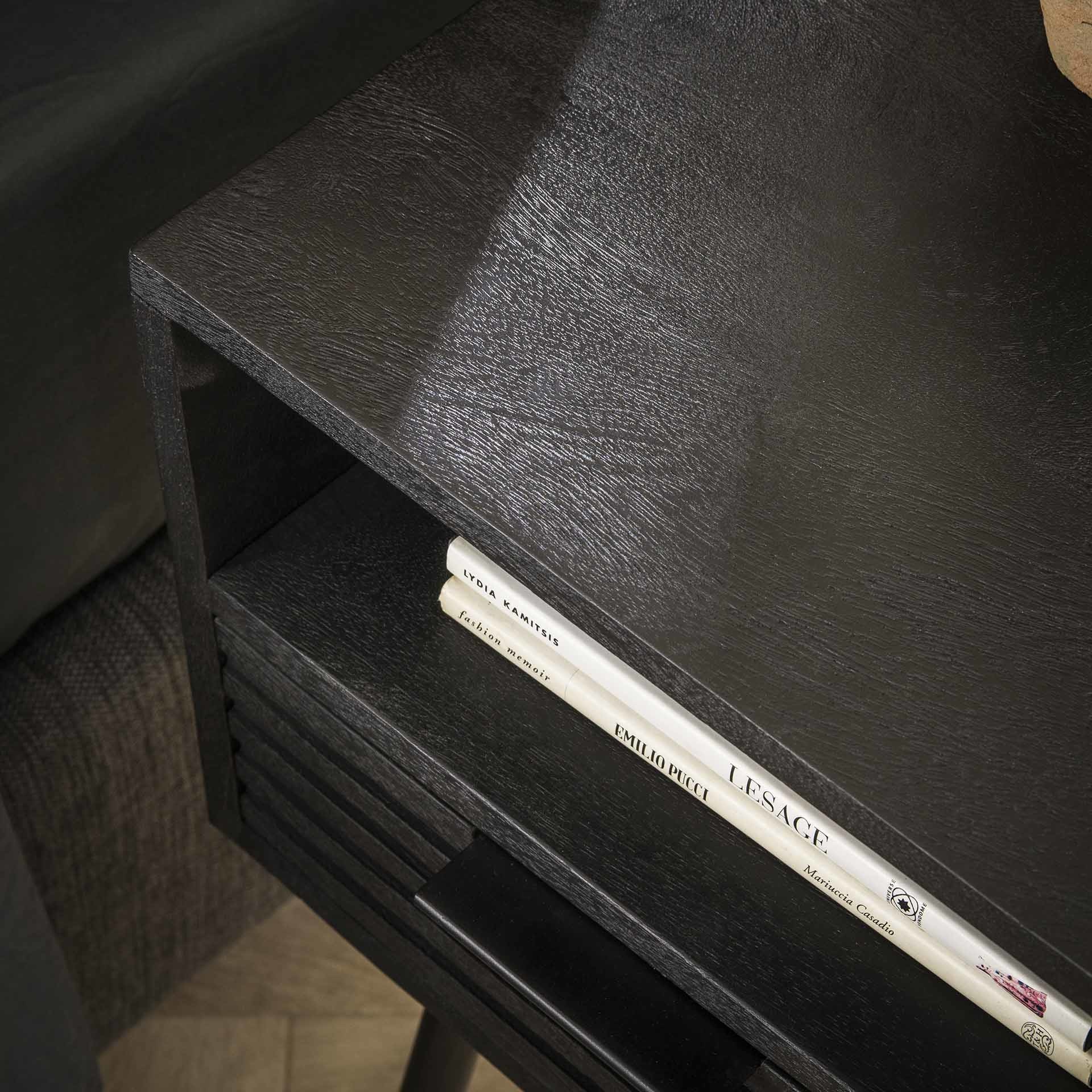 Black Beach – Nachttisch – Mango – schwarz geschliffen – 1 Schublade – 1 Nische – Stahlbeine