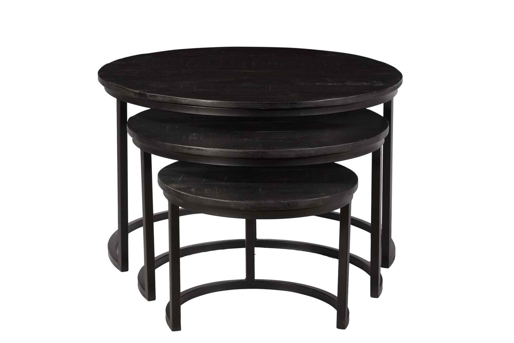 Die Black Omerta Beistelltische sind aus schwarzem massivem Mangoholz gefertigt und werden von halbkreisförmigen Stahlrahmen getragen. Die Tische sind mit einer Schicht aus beschichtetem Stahl versehen und für einen stilvollen Look lackiert.