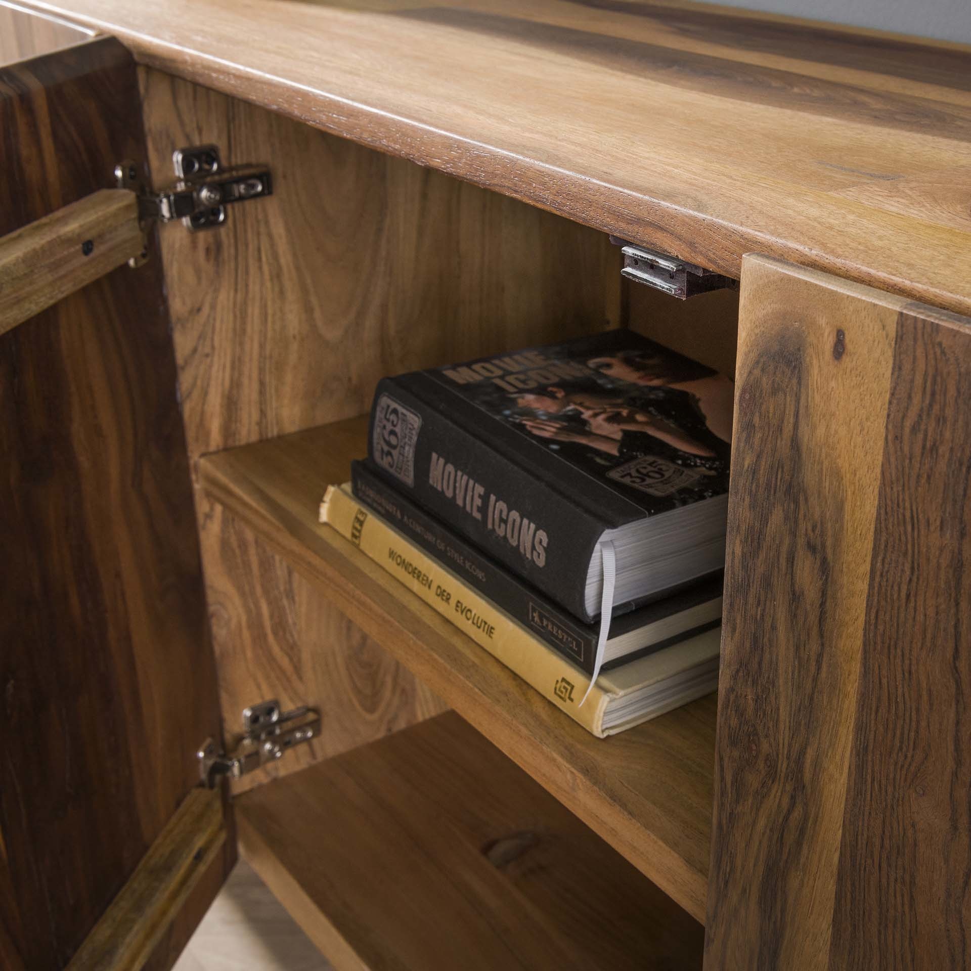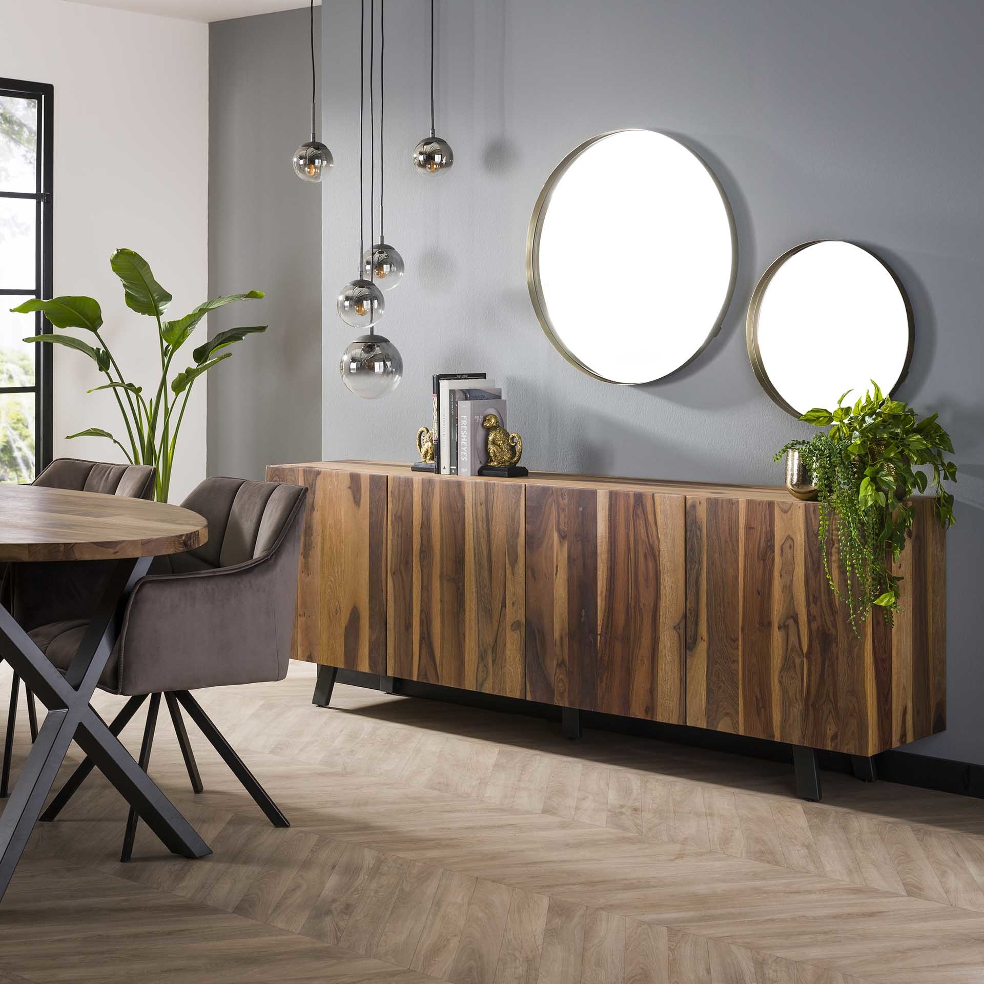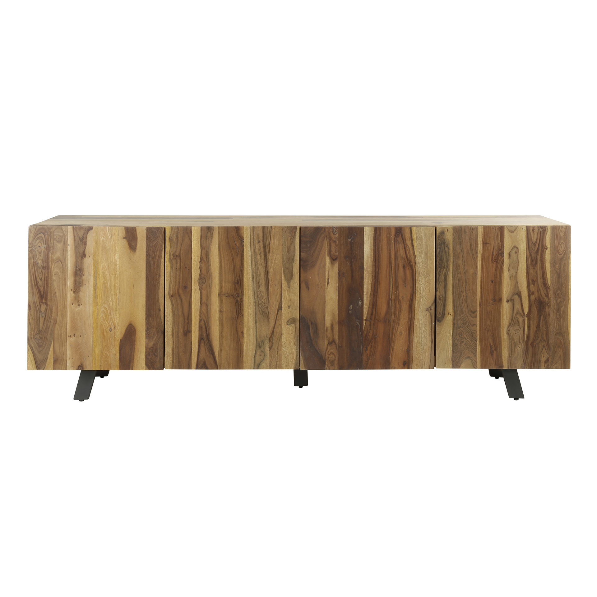 Dieses schöne Sideboard aus der Kollektion “Juglans” ist aus natürlichem Saja-Nussbaum gefertigt und wird von 5 dunkelgrau beschichteten Stahlbeinen getragen. Die 4 Türen dieses schönen Möbelstücks sind außerdem mit einem Blindverschluss versehen.