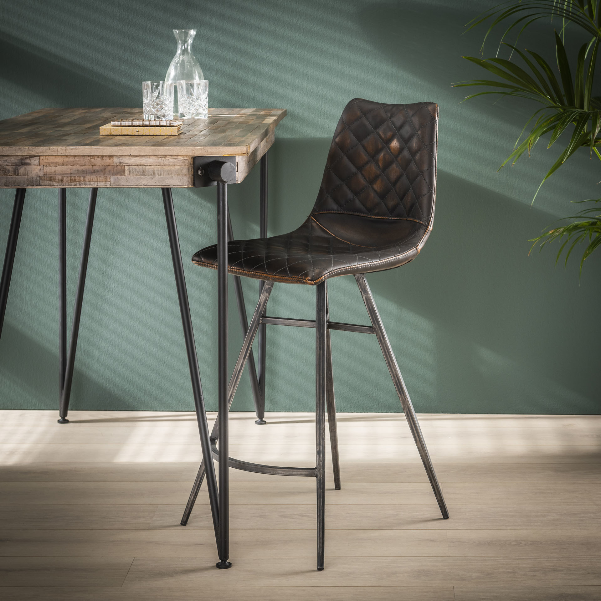 Diamond Leather – Barstoel – set van 2 – washed PU – bruin – geruit – kruispoot – metaal