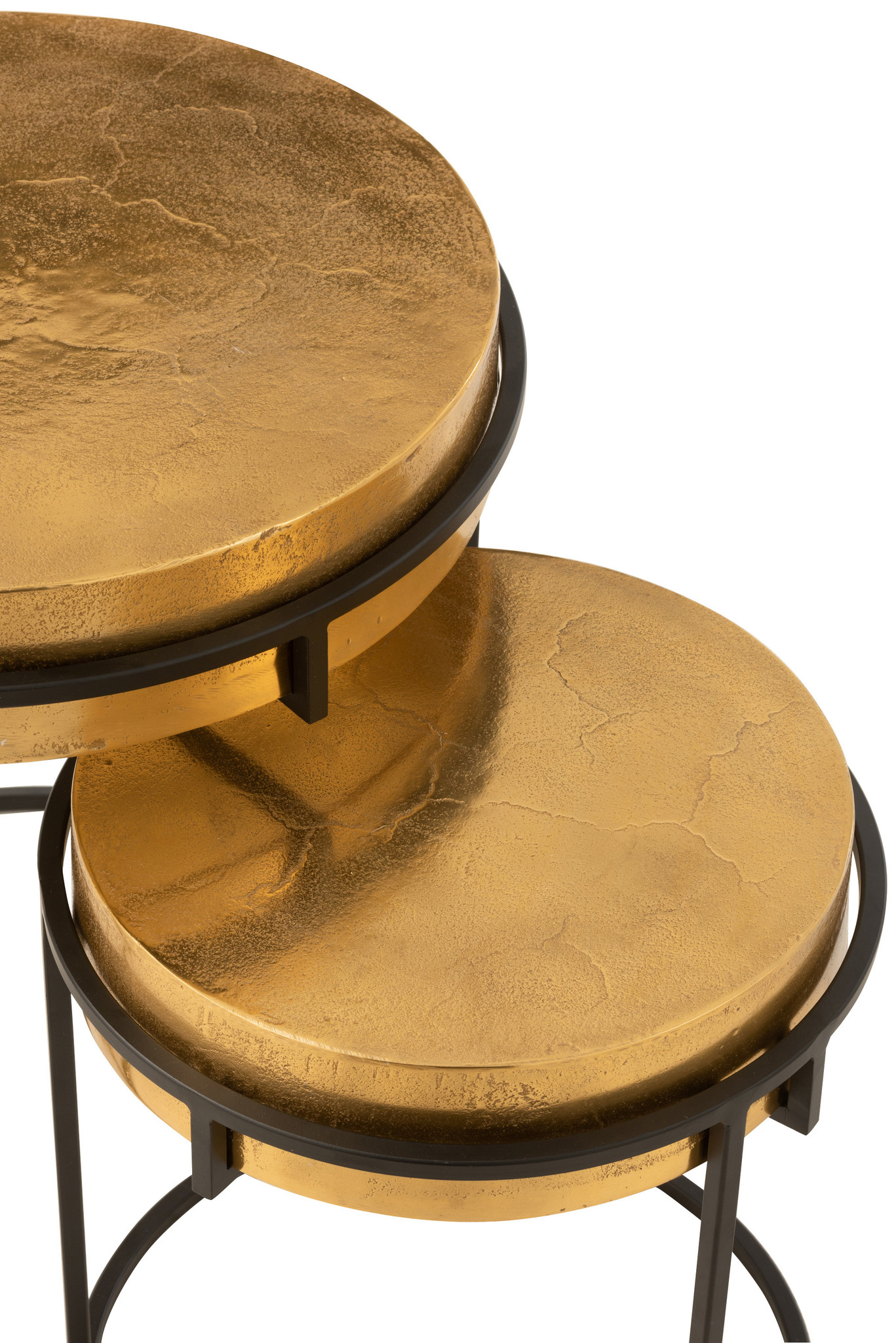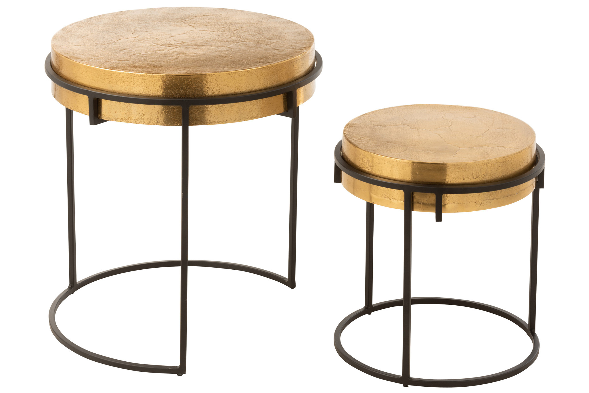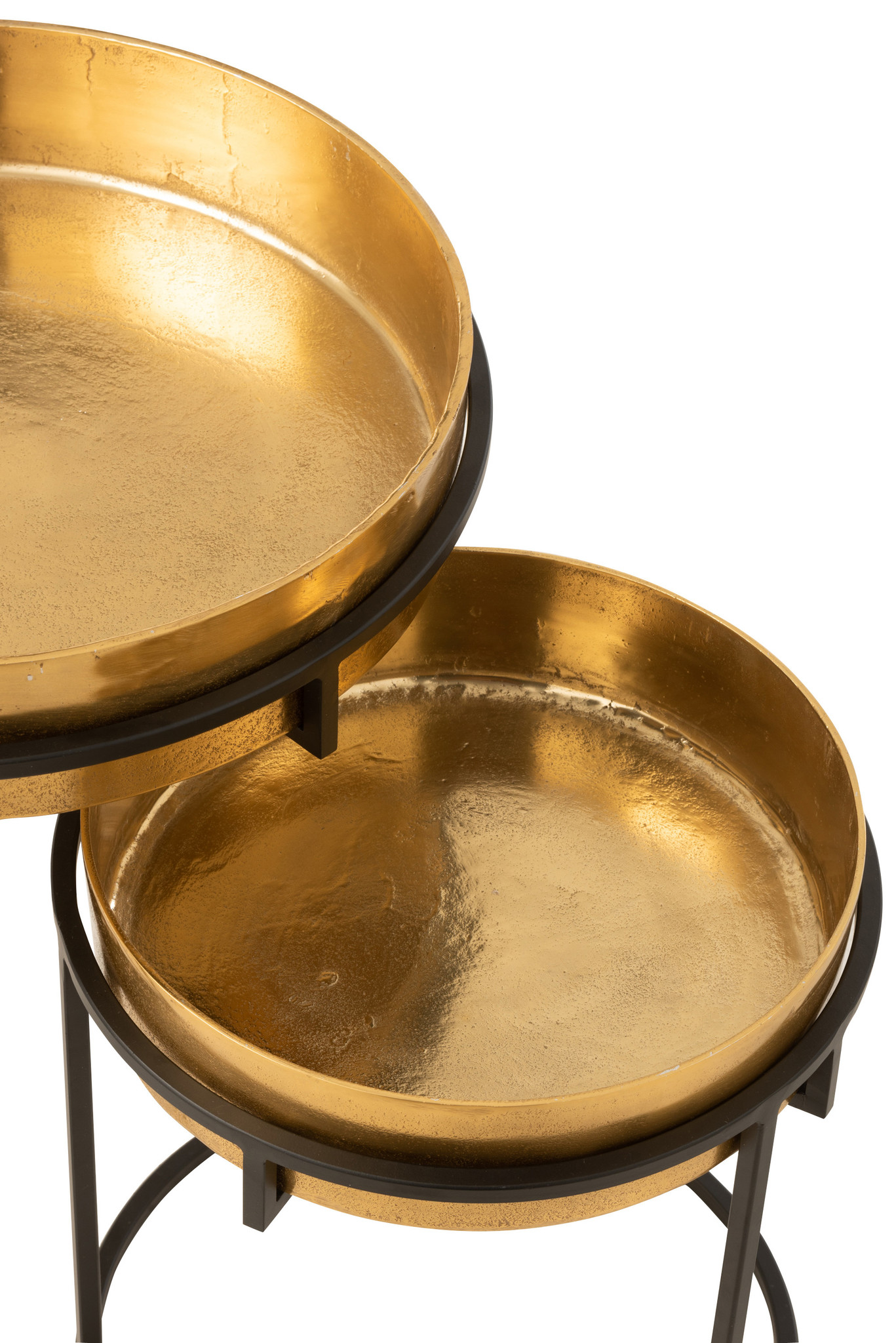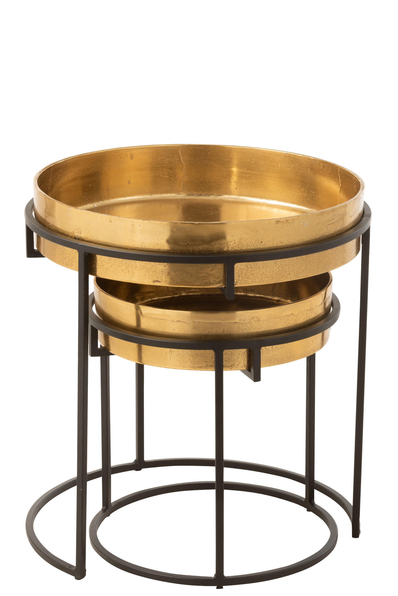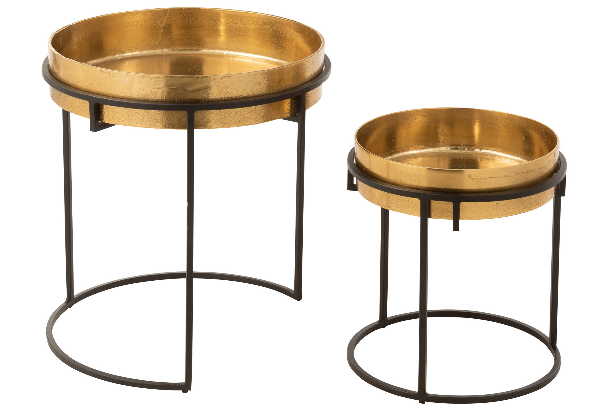 Deze designvolle bijzettafeltjes zijn vervaardigd uit aluminium met een gouden blad en een zwart frame. Het frame van het grotere tafeltje is halfrond, zodat het kleine tafeltje er perfect onder past. Bovendien zijn beide tafelbladen omkeerbaar, zodat er een hoge rand beschikbaar wordt. Ideaal om drankjes op te dienen!